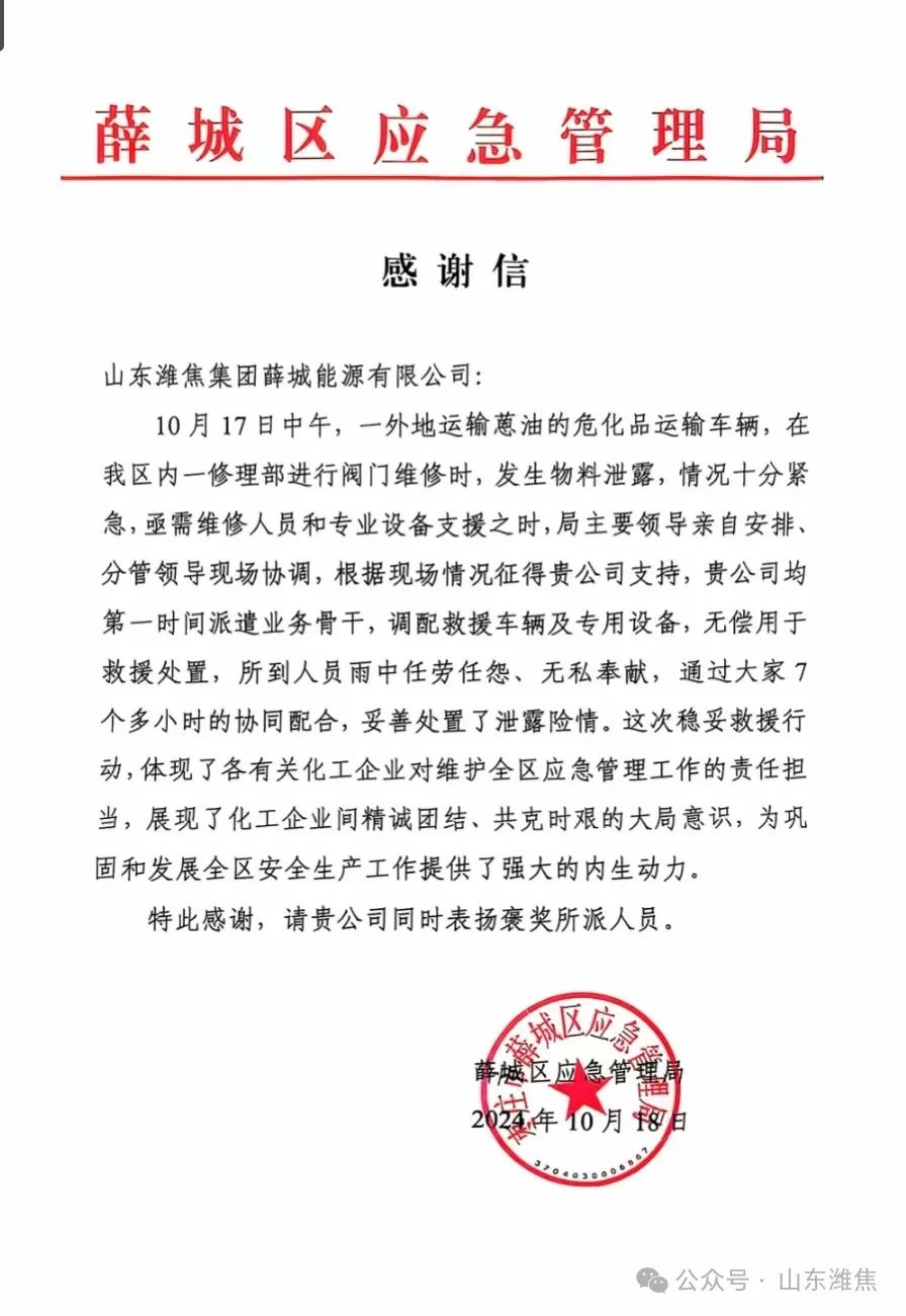 10月17日中午,一外地運(yùn)輸蒽油的?;愤\(yùn)輸車輛,在薛城區(qū)一車輛修理部進(jìn)行閥門維修時(shí),突發(fā)?;肺锪闲孤┦鹿?,情況十分緊急,薛城能源公司接訊后,派遣業(yè)務(wù)骨干,調(diào)配救援車輛及專用設(shè)備,無償用于救援處置。參加救援人員冒雨操作,任勞任怨、無私奉獻(xiàn),經(jīng)過7個(gè)多小時(shí)的協(xié)同配合、緊急救援,?;沸孤╇U(xiǎn)情成功妥善處置。